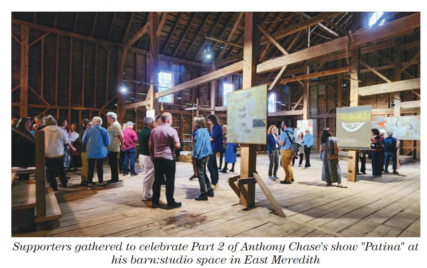 ANDES — Throngs of supporters gathered in East Meredith Saturday night for Part Two of Anthony Chase’s,show “Patina” with Hawk,+ Hive Gallery. The showopened with a traditional,reception at Hawk + Hivein Andes on August 3rd and,continued with an open studio,party at Chase’s newly,renovated studio and cathedral-like barn showcasing,eleven larger format paintings. It was quite the joyous,occasion complete with friends, collectors and fellow artists all vying to congratulate the artist, a delectable feast lovingly prepared by his wife Nini Ordoubadi and friends, and a DJ pumping beats in the barn. But the real showstopper was Chase’s stunning paintings.